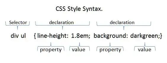 - Notice in the example that each rule consists of a CSS property and its value, separated from it with a full colon. The rules are separated from one-another by semi-colons, and if desired, an additional semi-colon can be added at the end. The whole expression is enclosed in curly brackets. Generally, spaces are permitted, but no space is permitted before a colon or semi-colon.
