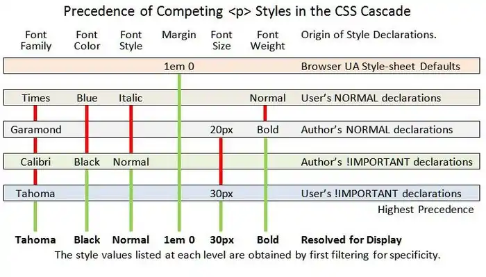 In the above hierarchy, the user's styles with the !Important keyword marking are given the highest priority of all, and the choice of styles will only revert to a lower level if the user's style-sheet has neglected to make an appropriate style entry, or neglected to mark it as !Important. A similar reasoning applies throughout all of the levels, for every tag's styles. In deciding which styles to apply, the browser also takes into account the specificity of each declaration. Specificity is the extent to which a declaration can be said to apply directly to a particular tag. Within each of the main levels, the browser sorts the styles for specificity, assigning a numerical value to each in order to decide which of the many has priority. A more specific style has priority over one that is more general. The higher the number, the higher the specificity and its priority. It is the style with highest specificity within a given level that represents it in the cascade hierarchy, but having a higher specificity alone does not permit the style to impose its styles beyond its level.