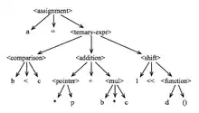 The semantics of a programming language is not defined by its syntax. There are, however, some aspects of a program's semantics that are completely determined by how the grammar of the programming language is organized. One of these aspects is the order in which operators are applied to their operands. This order is usually defined by the precedence and the associativity between the operators. Most of the algorithms that interpreters or compilers use to evaluate expressions tend to analyze first the operators that are deeper in the derivation tree of that expression. For instance, lets consider the following C snippet, taken from Modern Programming Languages: a = b < c ? * p + b * c : 1 << d (). The side figure shows the derivation tree of this assignment.