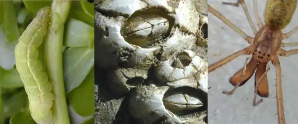![]() The three largest groups within the Phylum Arthropoda are the insects (moth larva), crustaceans (barnacle), and arachnids (spider). |