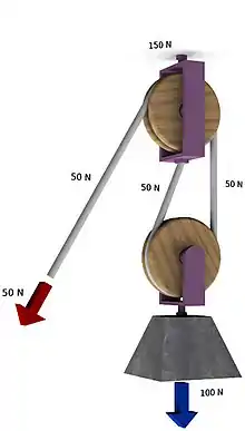 There is often confusion about how much mechanical advantage is provided by the trucker's hitch. For example, when used like in this pulley diagram, such as if the rope above the Trucker's hitch were tied to a rafter in the ceiling, and a weight were being lifted off the floor, the advantage would only 2:1 instead of 3:1. Notice that even though the 100 N force holding up the weight in the diagram is two times the 50 N pull on the end of the rope, the rope from the rafter to the upper pulley must resist both the load weight and the downward pull on the rope end. Thus, the tension in the upper rope would be three times higher than the pull on the rope end. In the more common use of the trucker's hitch, the lower pulley is a hook or ring on the rail of a truck, and the rope across the top of the load has a tension three times the pull on the end. When the end is secured to the loop of the trucker's hitch with a pair of half hitches and let go, the tension in the two segments of rope around the ring will rise 50%, to 75 N each.