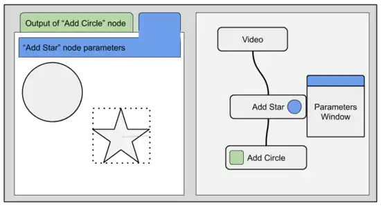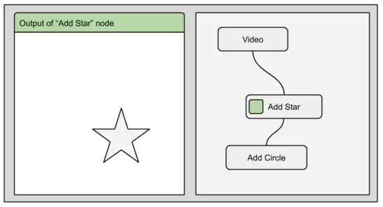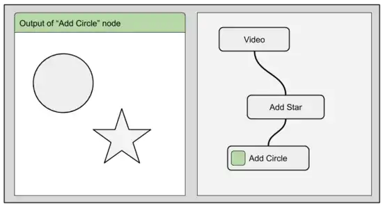 The sketches below show a node-graph with 3 nodes. The top most node represents a video. The node below adds a star on top of the video, and the last node adds a circle on top of the video+star.