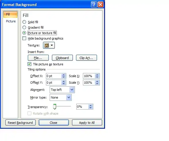 - Click the radio button for Picture or texture fill