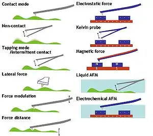 • Kelvin probe microscopy. By applying an oscillating voltage to an oscillating cantilever in non-contact mode and measuring the charge induced oscillations, a map can be made of the surface charge distribution.
