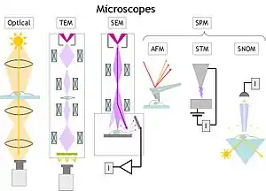 Scanning Near-field Optical Microscope (SNOM): As electrons can tunnel between electrical conductors in the STM, photons can tunnel between optical guiding structures. The SNOM uses a narrow light guide to measure how the optical electromagnetic field changes as the guide is moved across the sample. For instance, light can be sent from below the sample and then scattered into the scanning light guide above it. The resolution can be much smaller than the wavelength of light.