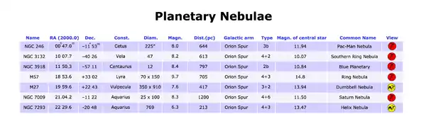 - Dist.(pc): approximate distance of the nebula, expressed in parsec. To obtain the distance in light-years, multiply for 3.26.