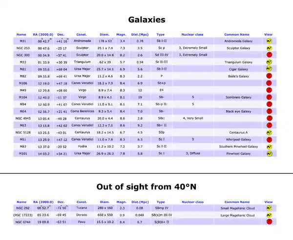 - Magn.: the apparent magnitude of the galaxy; a symbol “:” after this value means an approximation.