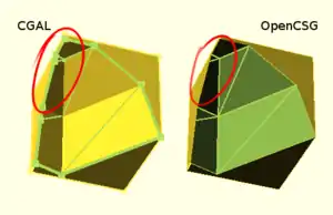 The difference between the CGAL and OpenCSG approaches can be seen at edges created by boolean operations.