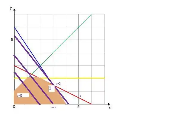 We now will shade the feasible region. To do that consider the constraints one by one. The first one is . To determine the region it represents, choose any point which does not pass through the line say (0,0). Substitute it in the constraint to get . Since this is true we conclude that (0,0) lies in the region represented by . We conclude that all the points on the side of containing (0,0) actually represent . This is suggested by the fact that the line divides the plane in 2 distinct halfs: One of points satisfying the inequality and one of those which don't.