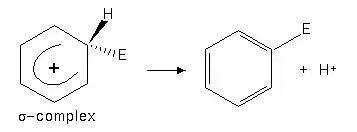 At the next stage the σ-complex decomposes, freeing a hydrogen cation and forming the product of substitution.