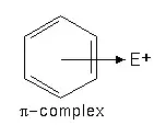 At first, the electrophile interacts with the delocalized orbitals of the aromatic ring and a π-complex is formed.