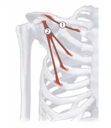| Pectoralis minor | Ribs 3-9 | Coracoid process | Scapular retraction; respiration | Medial and lateral pectoral nerves (C6-T1) | ![]() 2 - Pectoralis minor |