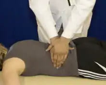 | Exhalation dysfunction key ribs 11-12 (quadratus lumborum) | Patient is prone. Physician is standing on the side of the table opposite the key rib. Contact the key rib with firm anterior pressure over the costotransverse junction of rib with one hand, and hold onto the ASIS on the dysfunctional side with the other hand. Ask the patient to perform a cycle of forced maximal inhalation and exhalation. During the inhalation phase, increase anterior/lateral pressure on the costotransverse junction of the key rib, while pulling posteriorly slightly on the ASIS to stabilize the pelvis. | ![]() Ribs 11-12 exhalation dysfunction |