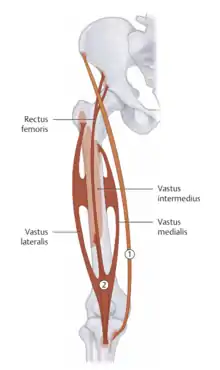Femoral nerve (L2-L4) | ![]() Quadriceps femoris muscles: vastus medialis, vastus lateralis, vastus intermedia, rectus femoris |