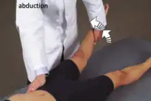 | Abduction | With the leg straight, it is taken to its abduction barrier | ![]() Spencer's technique of the hip - abduction |