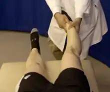 | Circumduction with traction | Extension of the knee; grasp the foot and ankle with traction and rotate the hip through increasingly large circles in both clockwise and counterclockwise fashion | ![]() Spencer's technique of the hip - circumduction with traction |