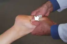 | Posterior Fibular Head Post-Isometric Muscle Energy: The patient is supine. The physician places the hand closest to the knee in the popliteal fossa so that the metacarpophalangeal joint of the index finger approximates the posterior fibular head and, with the other hand, externally rotates the patient's foot until the restrictive barrier is reached. The patient is told to internally rotate the foot and the physician will resist the motion with an isometric counterforce. In each respective iteration, the patient is taken further into the restrictive barrier. | ![]() Posterior Fibular Head Post-isometric Relaxation Muscle Energy |