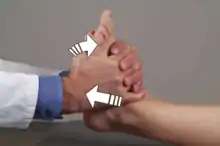 | The patellar grind test is used to assess for chondromalacia. With the patient supine, the patella is pushed superiorly and held. The patient is asked to contract the quadriceps muscles. The test is positive if the patient expresses pain or grind is palpable. |