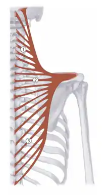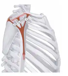 | Rhomboid minor | C6-C7 spinous processes | Medial border of scapula | Medial and upward movement of scapula | Dorsal scapular nerve (C4-C5) | ![]() 2 - rhomboid minor |