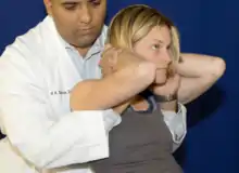 | Seated HVLA (Full Nelson): The patient is seated on the table, while the physician stands behind the patient. The patient is instructed to interlock their hands behind her head. The physician weaves their arms from anterior to posterior through the opening created by the patient’s arms, and interlocks their hands on top of the patient’s hands. The patient is instructed to bring their elbows together and relax and look up toward the ceiling. The physician then brings the dysfunctional transverse process or apex of a group dysfunction into contact with the physician’s sternum. The physician instructs the patient to take a deep breath in and out. At the end of exhalation with the physician’s knees bent, the physician exerts a quick but gentle thrust superiorly and posteriorly from their legs. | ![]() Full Nelson |