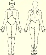 The main problem is usually recorded on a body chart, all which have similar features and all are similarly asexual. The chart on the right is a more or less standard view of one. It shows an anterior and posterior view of the body (some charts have left and right views as well) and shows it in the anatomical position. It is the ideal place to reflect the description and relationship of symptoms. You could qualify them as following: nature, depth, frequency and impact. If the symptom is pain, you could add the VAS/NRPS grade. Some departments will have their own symbols for describing pain, stiffness, acute, chronic, whether it radiates, etc.