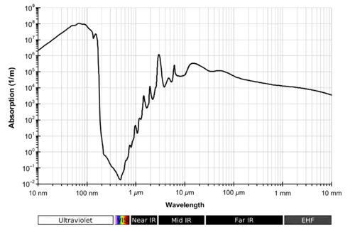 Your eyes are perfectly adapted to seeing light in the visible spectrum within a narrow band of wavelengths (380 to 700 nanometers). The visible spectrum of light is the range of light waves from the sun that are able to pass through the atmosphere to reach the surface of the Earth. You can’t see Ultraviolet wavelengths (smaller than 380 nanometers) because so few UV light waves make it through the oxygen rich atmosphere. Likewise, water vapor (H2O) blocks much of the InfraRed wavelengths (greater than 1,000 nanometers) coming from the sun. Your eyes are adapted to a narrow slit of visible light wavelengths within the range permitted to pass through the Earth’s atmosphere. All the colors of the world; violet, indigo, blue, green, yellow, orange, and red, are of course not all the colors that exist, but are the range of wavelengths of light allowed to pass through the gasses that are found in Earth’s atmosphere. Water vapor (H2O) as a Green House gas is one of the most important, as a large molecule, water vapor in the air arises from evaporation and is measured by relative humidity.