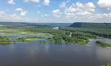 The Mississippi River at the confluence with the Wisconsin River. The river flows across a broad flat region, with thick green forests.