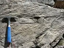 Fluvial cross bedding in sandstone, deposited by an ancient river. The direction of the river flowed can be determined by the orientation of these cross beds seen in the rock.