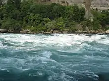 White water rapids are a result of the steep gradient of the water's flow downstream.
