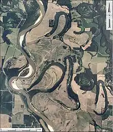 Point bars and cut banks along a meandering river.