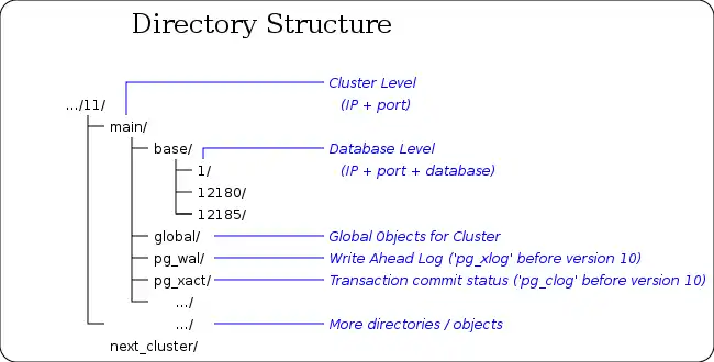 Within a cluster there is a fixed structure of sub-directories and files. All information is stored within these files. Some information is global to the cluster, and some belongs to single databases - especially tables and indexes.