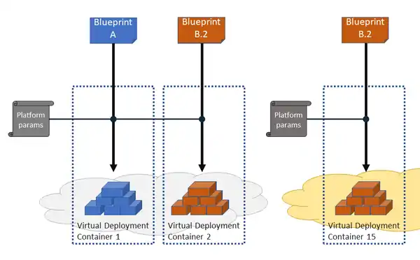 This is illustrated in the figure above, where Blueprint B.1 has previously been deployed in Virtual Deployment Container 2. But then the users improved the application, resulting in the Blueprint B.2. After submitting this blueprint to Virtual Deployment Container 2, the previous deployment has been removed and a new one gets installed. This change leaves the deployment in Virtual Deployment Container 1 intact. Users can create as many containers as needed, for instance to use for personal experimentation of a new technology, specific branches in Continuous Integration, or for manual acceptance testing of new releases.