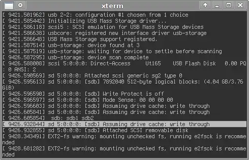 In the highlighted line (and in fact the line above that even clearer) you can see what the device file identifier is for the USB device you have just plugged in, and how many partitions are on it already. In this case there are two partitions on /dev/sdb already, /dev/sdb1 and /dev/sdb2 - make sure you have all data on these partitions backed up, as they will be wiped off the drive completely. All data will be lost!