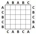 • Place letter A,B and C exactly once each into every row and columns of cells inside the grid.