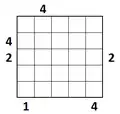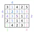• Place 1 to 5 into each column and row of the grid. The grid is placed so that the clue number outside represents the number of digits that are 'visible' from that point