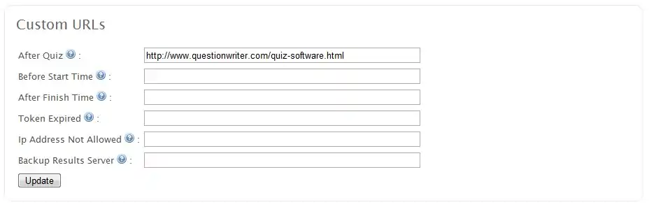 Leave the fields blank to use Question Writer Tracker's default error pages. Usually you'll want to leave the last field, the Backup Results Server blank to use the default Backup Results Server.