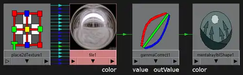 - Connect the outValue of the "gammaCorrect1" node (outValue > outValue) with the color of the "mentalrayIbleShape1" node in the same way. If you have done everything as described, you should see something that is connected like this: