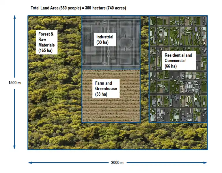 Total project land, including the industrial, residential and commercial areas is estimated at 4500 m2 per full time person, or just under 300 hectares (740 acres) for the 2600 total people at 25% average time. The land area for each person is estimated to include 1000 m2 for residential and commercial, including 200 m2 of building floor area. It also includes 500 m2 for industrial land, of which 200 m2 is buildings or constructed equipment, 500 m2 for farm and greenhouse space, and 2500 m2 for sustaining forest and raw materials extraction.