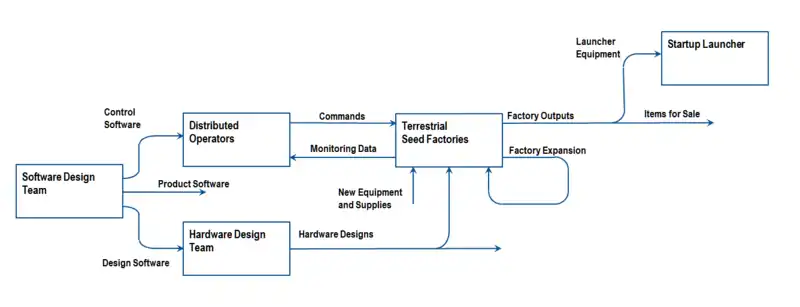 Beyond the choice of existing vs new production methods, the question of what functions are needed in production, and what seed elements are preferred comes next. Production on Earth is very wide ranging and complex, so the choices here are not obvious. We can at least identify it as an area for more work. One way to organize the choices is between functions needed in many locations, and ones that are specific to particular locations. Figure 4.1-2 is an early version of a process flow to develop seed factories. Considerably more detail will be needed before any final choices can be made.