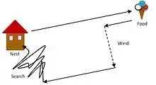 Path integration is a kind of dead-reckoning where there is ongoing localisation via measurement of the direction, the velocity and the time taken [2][5]. This requires an accumulator as a core component of the whole system [6]. As a result the ant obtains a vector with the resulting distance and direction it went relative to the nest's position [5]. To know headings for a desired site, an output vector is generated by subtracting the current path integration state from the memory of the path integration state at the goal [4][5].