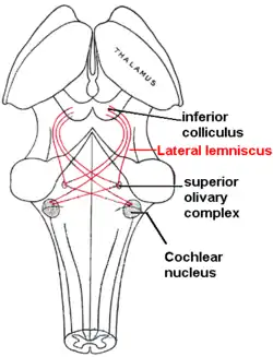 Lateral lemniscus in red, as it connects the cochlear nucleus, superior olivary nucleus and the inferior colliculus. Seen from behind.