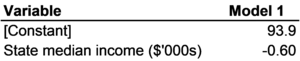 Predicted values and expected values are very similar concepts. In fact, many people use the two terms to mean the same thing. The difference between them is really just a difference in intentions. The regression line plots the expected values of the dependent variable based on the actual observations of the independent variable. Predicted values are expected values that are used to make predictions about cases for which data do not exist. For example, in Chapter 1 when we were using state median income to study soft drink consumption across the United States we were missing soft drink data for Alaska and Hawaii. Both Alaska and Hawaii were missing data for the dependent variable. Data for the independent variable, state median income, are available for both states: $60,945 for Alaska and $65,146 for Hawaii. These income data can be combined with a regression model using data from the rest of the United States to predict soft drink consumption in Alaska and Hawaii. Figure 3-8 reports the results of a regression model with state median income as the independent variable and state per capita soft drink consumption as the dependent variable. The regression line in this model has an intercept of 93.9 and a slope of -0.60. This means that every $1000 of additional income is associated with a decline of 0.60 gallons in the amount of soft drinks consumed. This regression line is the line that appears on the scatter plot in Figure 1-2. The equation for this line is Soft drink consumption = 93.9 - 0.60 x State median income in thousands of dollars.