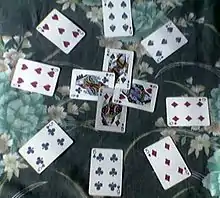After the foundation cards are found, the rest of the stock is dealt to look for cards that can be built on the foundations. In case the queens are shuffled into the deck, when a queen is found, it is placed on the center.
