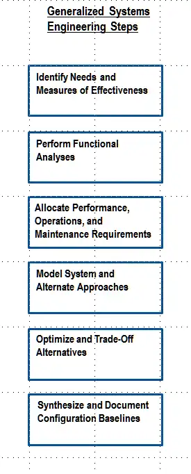 Given an identified need or desire, how does one select the best design to satisfy it out of the infinite number of possible solutions? For a complex project, the concept of a System has proven useful. A System is defined as a functionally, physically, and/or behaviorally related group of regularly interacting or interdependent elements. They are distinguished from the rest of the Universe by a System Boundary (Figure 1.5-1). A system is not a physical entity, but rather a mental construct, created because of it's usefulness, by drawing a line or surface around a collection of elements. The elements have internal relationships to each other and form a comprehensible whole. The rest of the Universe outside the system is referred to as the System Environment, or simply the environment. Flows of many types enter and leave the system as Inputs from and Outputs to the environment by crossing the system boundary . The scope of a given engineering task is then defined by the system boundary, what crosses the boundary, and what is inside. Systems may contain smaller systems within them, which are called Subsystems. These may be nested to any level, but flows into and out of a subsystem must appear in the parent system, or at the top level in the environment. This rule may be called Conservation of Flows - that flows do not appear from or vanish into nothing. Following that rule ensures that all the required inputs and outputs are accounted for.
