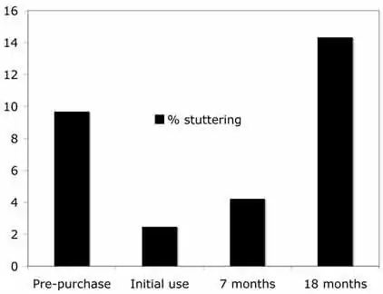 Six subjects returned for a second follow-up, on average of eighteen months after purchasing the devices. Two subjects were stuttering about as much as before they purchased the device. The other four subjects were worse. On average, the device now increased stuttering about 50%.