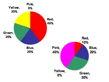 A pie chart showing preference of colors by two groups.