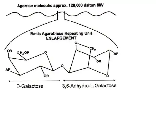 In DNA electrophoresis, agarose gel is the common support material used. Agarose is a linear polymer of D-galactose and 3,6-anhydrogalactose that is isolated from seaweed. It forms a macroporous matrix which allows rapid diffusion of high molecular weight macromolecules without significant restriction by the gel. The concentration of agarose in the gel determines the average pore size. The size of a gel controls the mobility and resolution of components because of the sieving effect of the pores on macromolecular species.