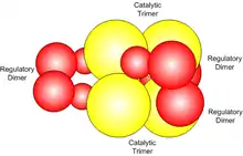 - Each r chain of each the regulatory subunit binds with a c chain of the catalytic trimer. The region of contact on between the r chain and c chain is stabilized by a domain of zinc bound to histidine residues in the r chain. All c chains have contact with the regulatory subunit.