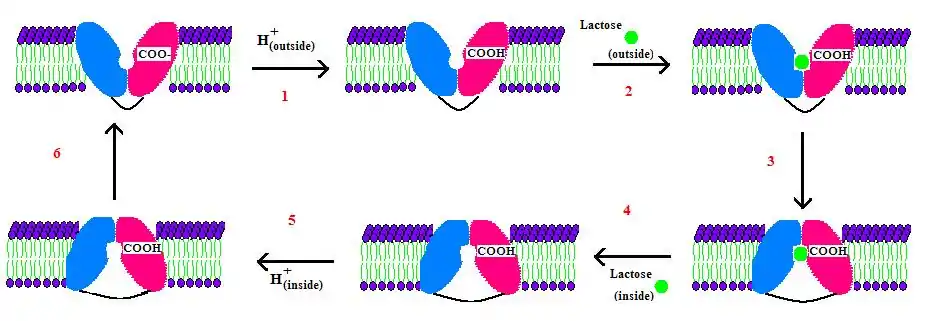 2. In the protonated form, the permease binds lactose from outside the cell.