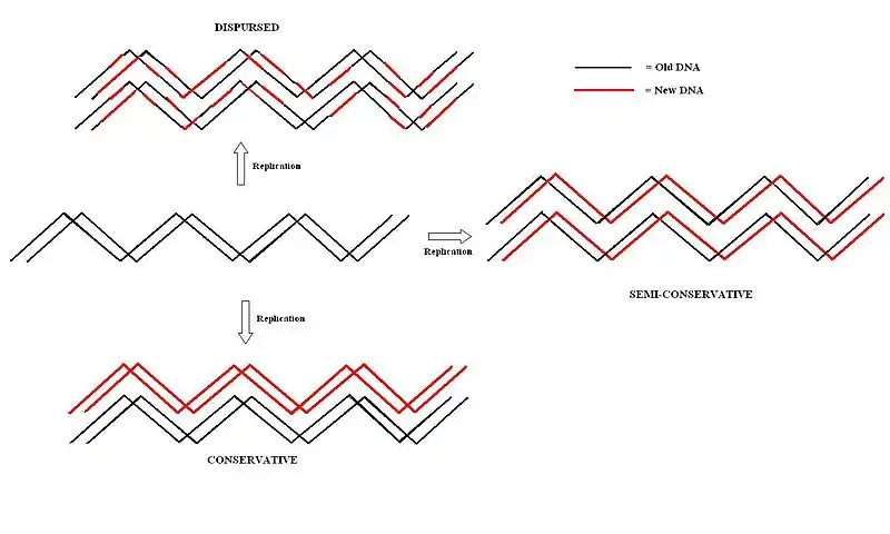 Watson and Crick proposed that DNA replicated semi-conservatively, but conservative and dispersive replication were still plausible until the theories could be disproved. In 1957, Matthew Meselson, and Franklin Stahl devised an experiment to determine whether DNA replicated following a conservative, semi-conservative, or dispersive model.